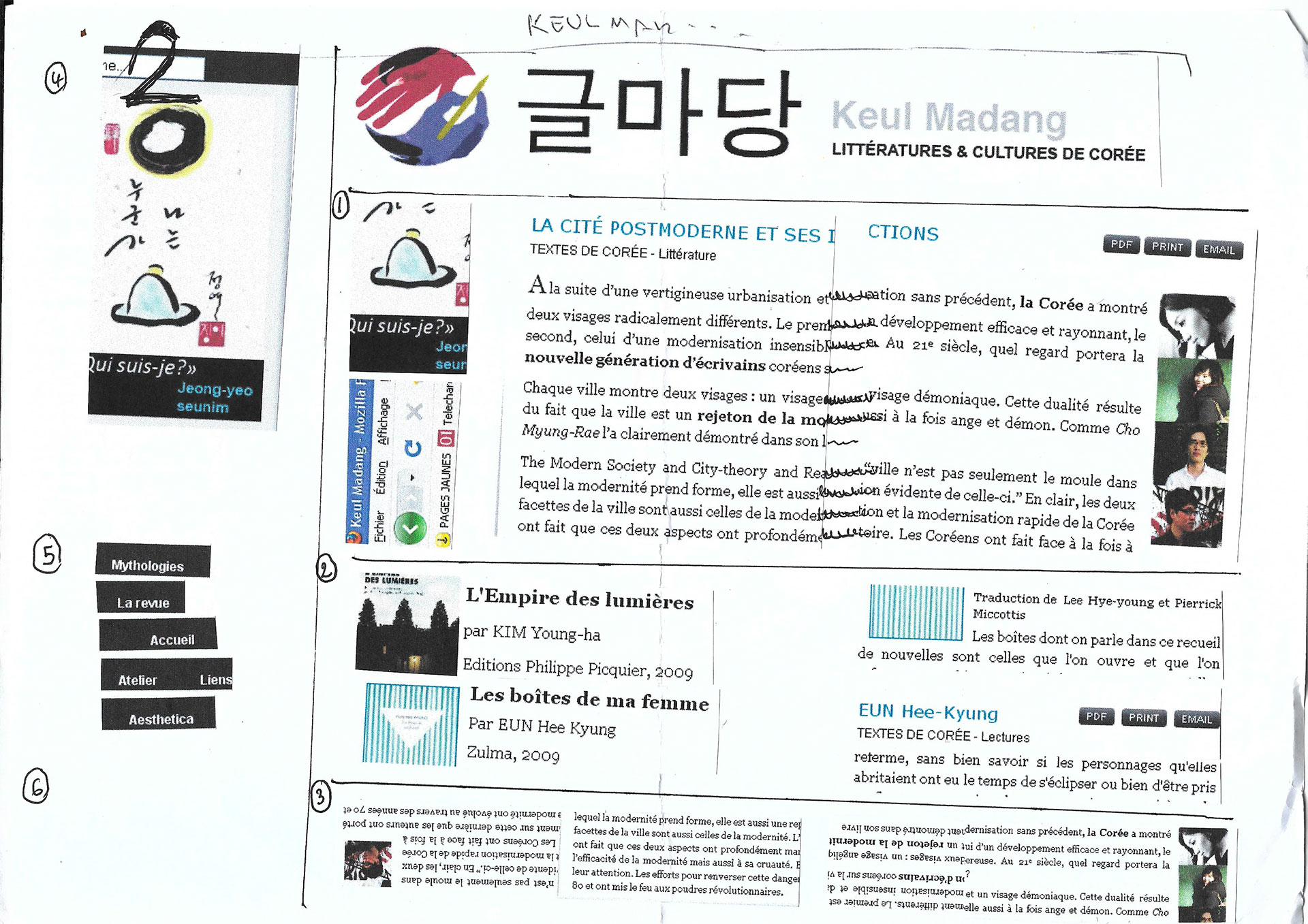 Sur ce carré d’asphalte a lieu une rencontre décisive, tandis que nous dinions au restaurant passe Julien Boyer, un frère de Kung-Fu, pas vu depuis longtemps. À la question : Que deviens-tu ? Je suis webmaster. Et toi : Je voudrais faire une revue sur le web. Keulmadang naît sur ce carré d’asphalte.